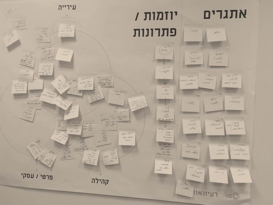 המשתתפים התחלקו לקבוצות עבודה ובראש כל קבוצה עמדה מנחה משלנו שהתוו את התהליך לאורך היום באמצעות כלים של חשיבה עיצובית. תוצרי התהליך מצטרפים לתוצרי 11 מפגשי רעיונאות נוספים שנערכו עם תושבי העיר תל אביב ויוצגו כהמלצות ליישום להנהלת העיריה.